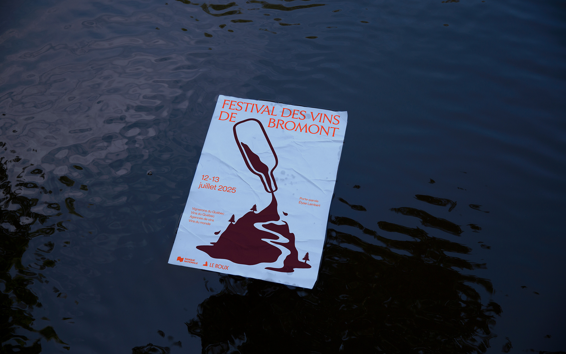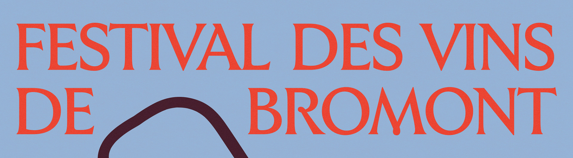 Se donnant comme mission de faire découvrir des vins aux gens de la région, Le Roux souhaite que le Festival des Vins de Bromont devienne une tradition. La typographie du titre fait écho, à travers ses détails, aux boucles que forment les vignes. Quant à l'illustration, celle-ci mêle de façon ludique le vin à la montagne bromontoise. Projet réalisé chez Bzoing.